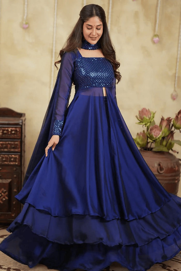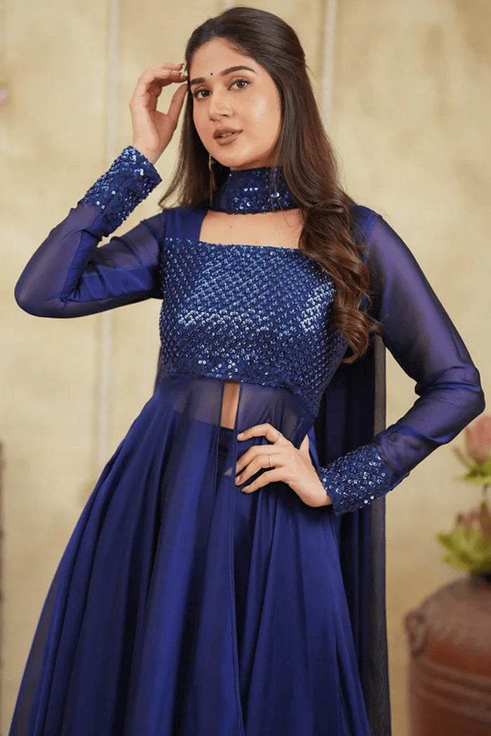 "A stunning ensemble crafted in rich navy blue Georgette silk, featuring a front-slit top paired with a flowing skirt. The highlight of this outfit is its intricately embellished yoke, adorned with heavy shiny cut bead work that adds a luxurious sparkle and texture. Elegant, graceful, and perfect for festive evenings or special occasions.