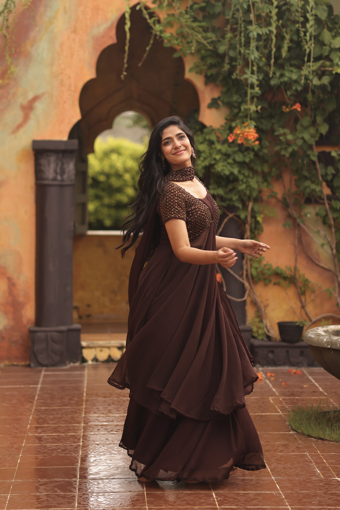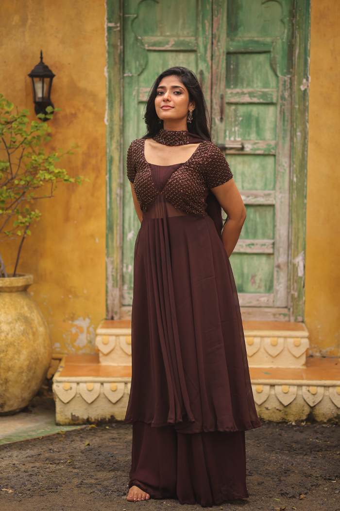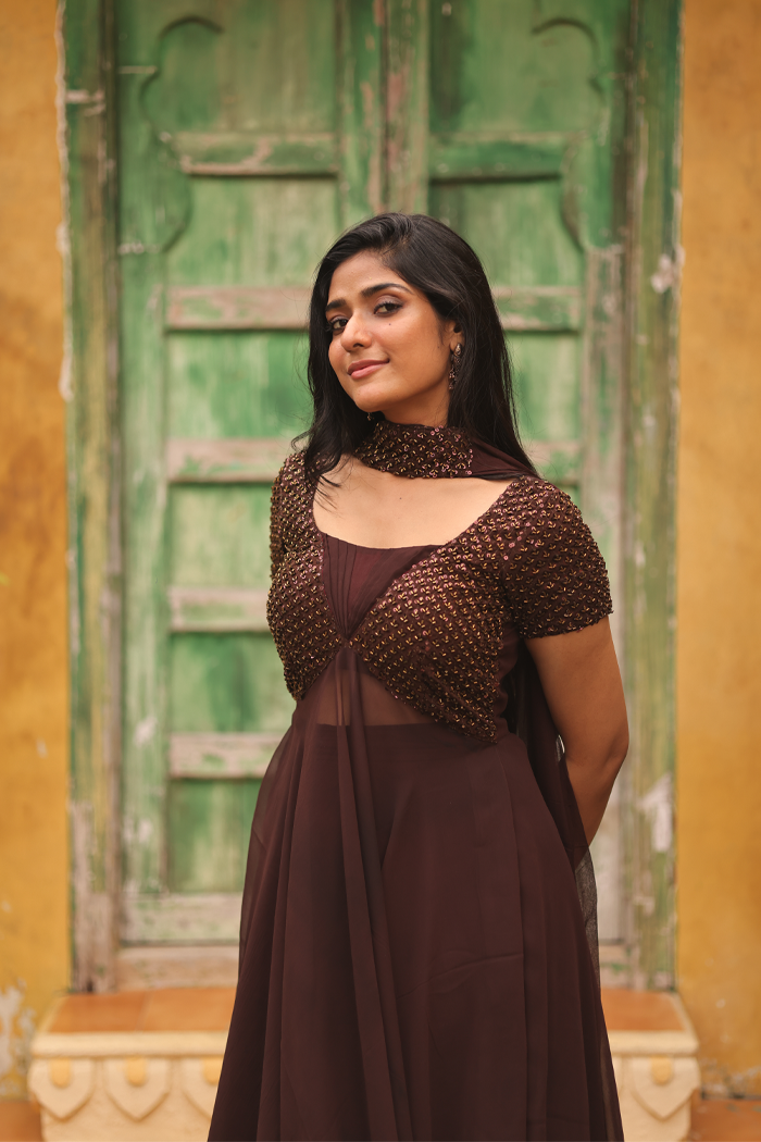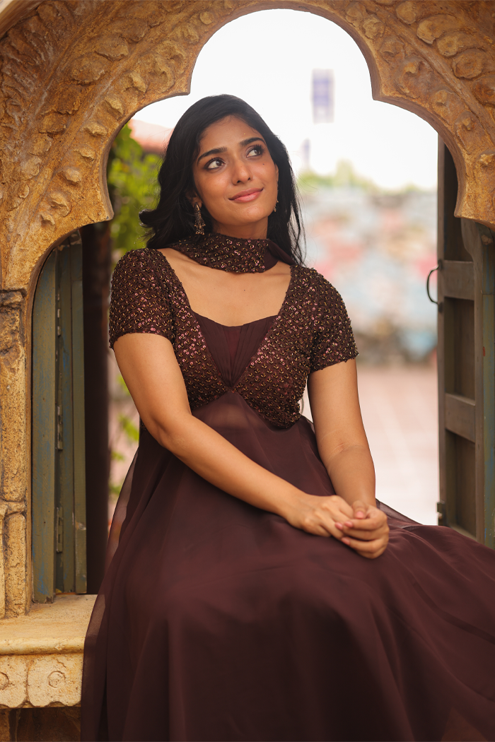 A rich chocolate brown Anarkali featuring an exquisitely handcrafted heavy cutdana yoke that adds a luxurious sparkle and dimension.Â