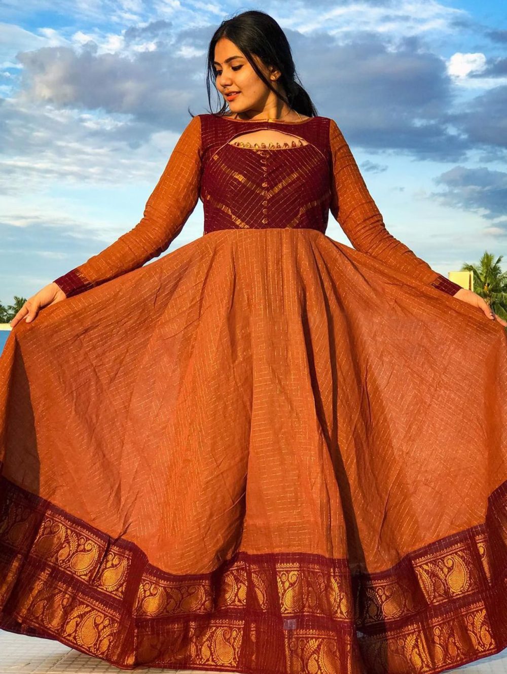Indulge in the luxurious feel and exquisite style of our custom-made Kamra A coffee brown sungudi cotton dress. This stunning long gown is designed to flatter your unique figure, offering unparalleled comfort and confidence. Made-to-measure clothing elevates your personal style, ensuring you feel amazing in every occasion.