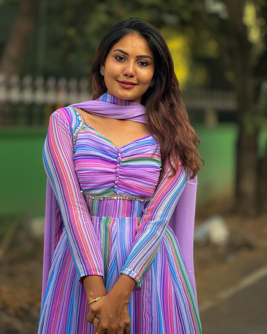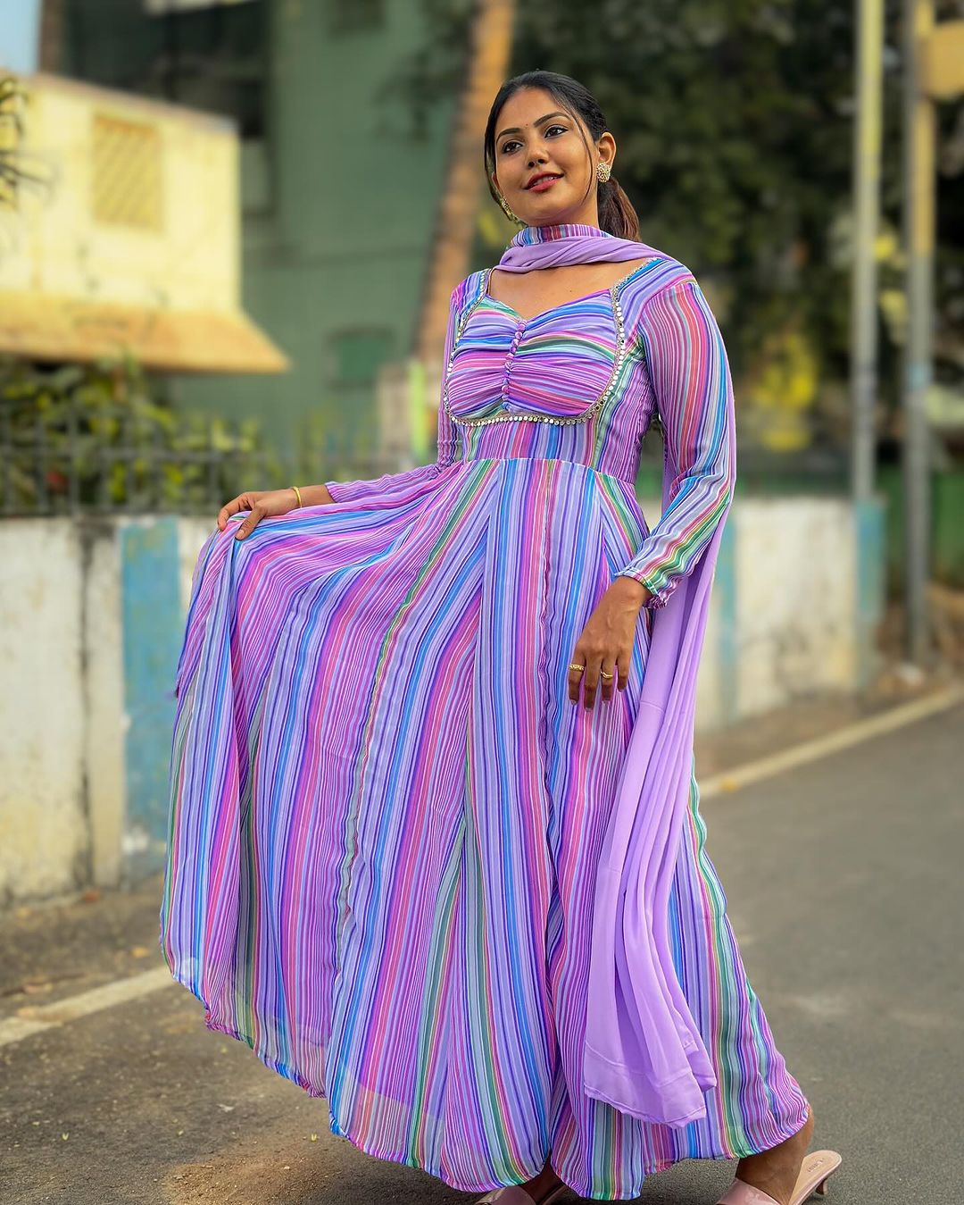 The multicolor striped rainbow georgette dress features vibrant stripes reminiscent of a rainbow. The yoke is adorned with intricate mirror lace, adding a touch of elegance and sparkle to the garment. The georgette fabric lends a light and flowing quality to the dress, making it perfect for special occasions or casual outings where you want to stand out with style.
