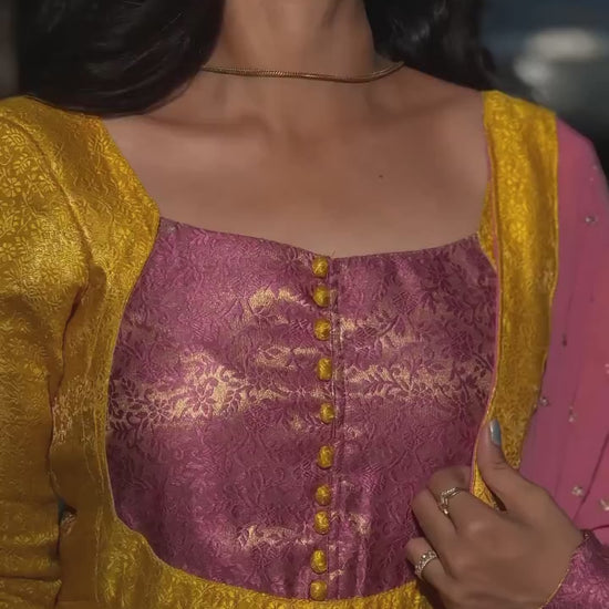 Get ready to shine in this stunning long yellow Banaras dress from Kamra. This custom-made dress is designed to fit your measurements perfectly, so you can feel confident and comfortable all night long. The traditional Banaras fabric is accented with sparkling sequin embroidery, adding a touch of glamour to your Diwali look. Complete the outfit with the elegant chinon silk dupatta, beautifully embellished with sequins, for an extra touch of luxury. Whether you're attending a Diwali party or hosting your own celebration, this dress is sure to turn heads and make you the center of attention. Celebrate the festival of lights in style with this unique and beautifully crafted dress from Kamra.
