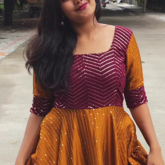 Step into the spotlight in the exquisitely crafted Kamra A mustard sequinned Georgette silk dress – a custom-made masterpiece designed to flatter your unique figure. This isn't just a dress; it's an experience, a celebration of your individuality, perfect for weddings, cocktail parties, or any special occasion demanding elegance and sophistication.
