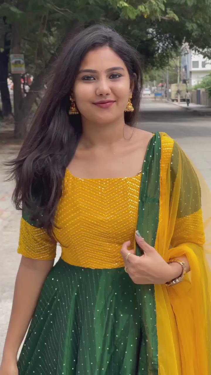 Imagine yourself gliding effortlessly across the dance floor, the luxurious Georgette silk whispering against your skin. The rich mustard hue adds a vibrant pop of color, perfectly complemented by the dazzling sequin embellishments and exquisite embroidery on the yoke. This isn't just a dress; it's a work of art, designed to make you feel confident and stunning. The included net dupatta adds a final touch of sophisticated elegance.