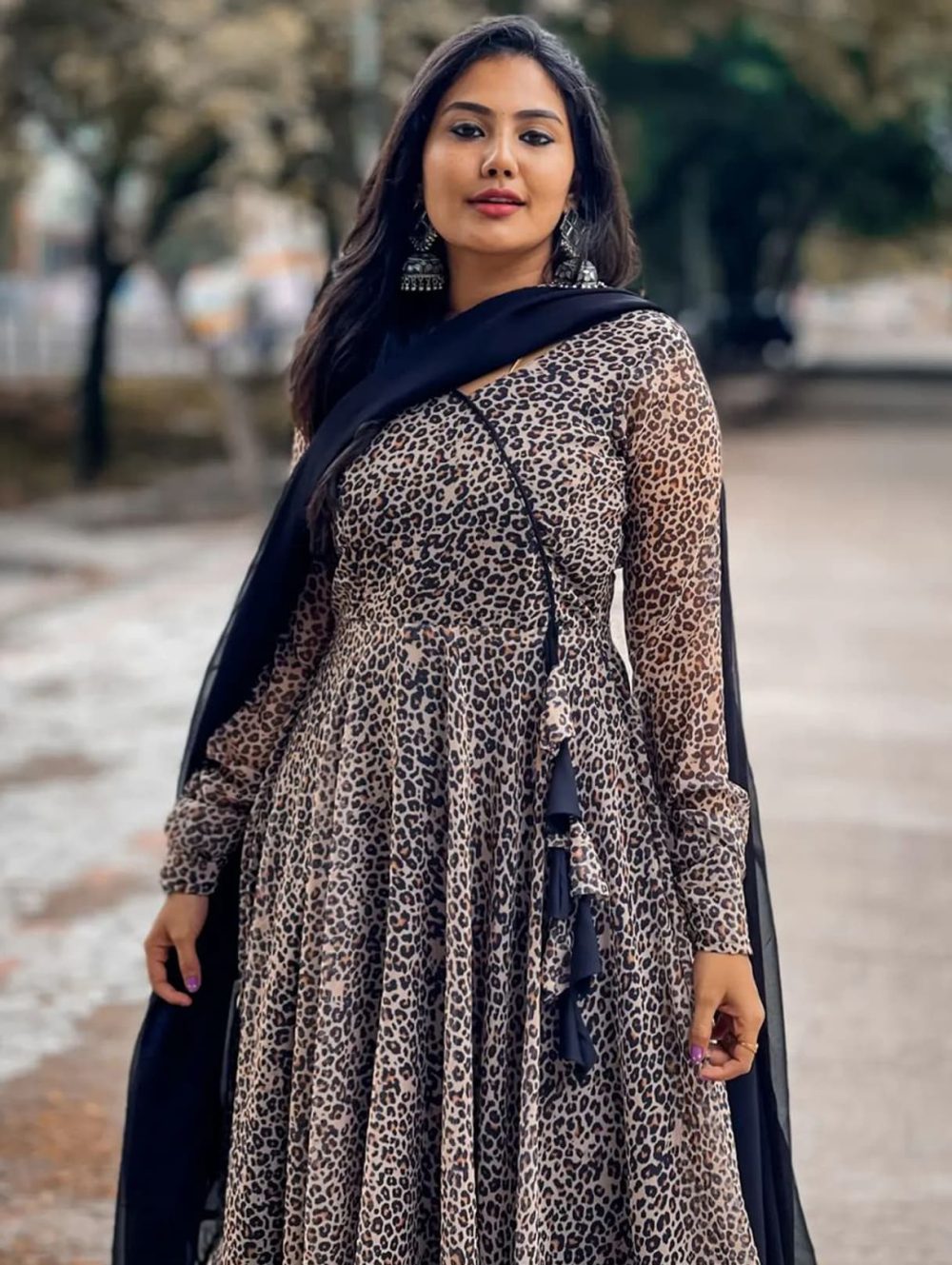 "Introducing the stunning women's long dress from Kamra, the perfect choice for those looking for a custom-made dress tailored to their unique measurements. This beautiful Anarkali features a stylish leopard print design, crafted from high-quality Georgette fabric that exudes elegance and sophistication.