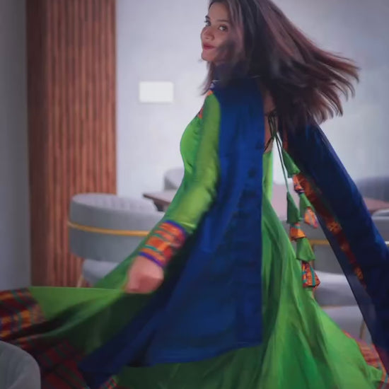 "Indulge in the timeless elegance of the MaliniGreen Narayanpet cotton Anarkali, a breathtaking ensemble perfect for any special occasion. This exquisite Anarkali, paired with a luxurious Georgette silk dupatta, is designed to make you feel as radiant as you look.