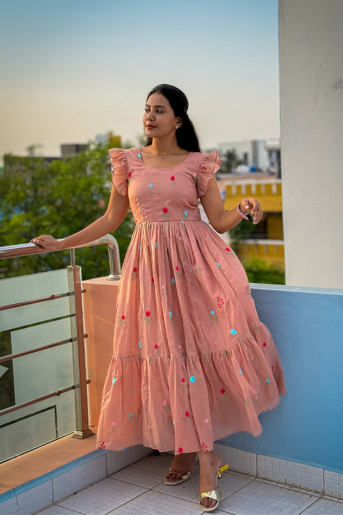 Flower Embroidery Casual Mul Chanderi Frock – Lightweight & Elegant Everyday Wear
