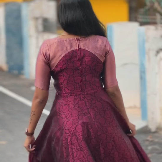 "Step into the spotlight this Diwali in the breathtaking Kamra custom-made long dress. This isn't just a dress; it's a statement. Designed to flatter your unique figure with precise, made-to-measure tailoring, this muted purple gown is the perfect blend of sophistication and festive flair. Prepare to be captivated by the intricate multi-foil mirror embroidery, adding a touch of regal elegance to your Diwali celebrations.