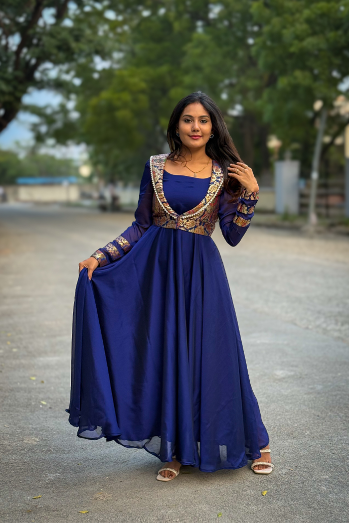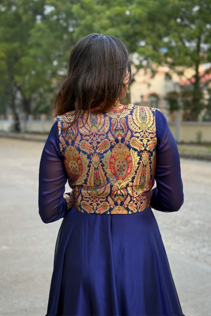 A stunning navy blue shiny Georgette long gown paired with a rich Banaras brocade overcoat. The overcoat features a sleek, structured collar and is elegantly outlined with delicate pearl beads, adding a touch of timeless sophistication. This ensemble blends modern elegance with traditional charm, making it a perfect choice for festive occasions, weddings, and evening celebrations.