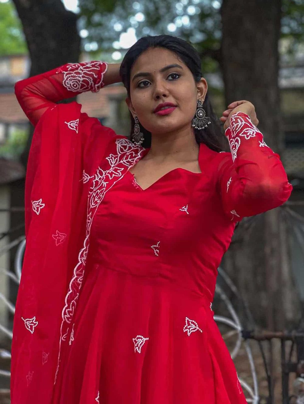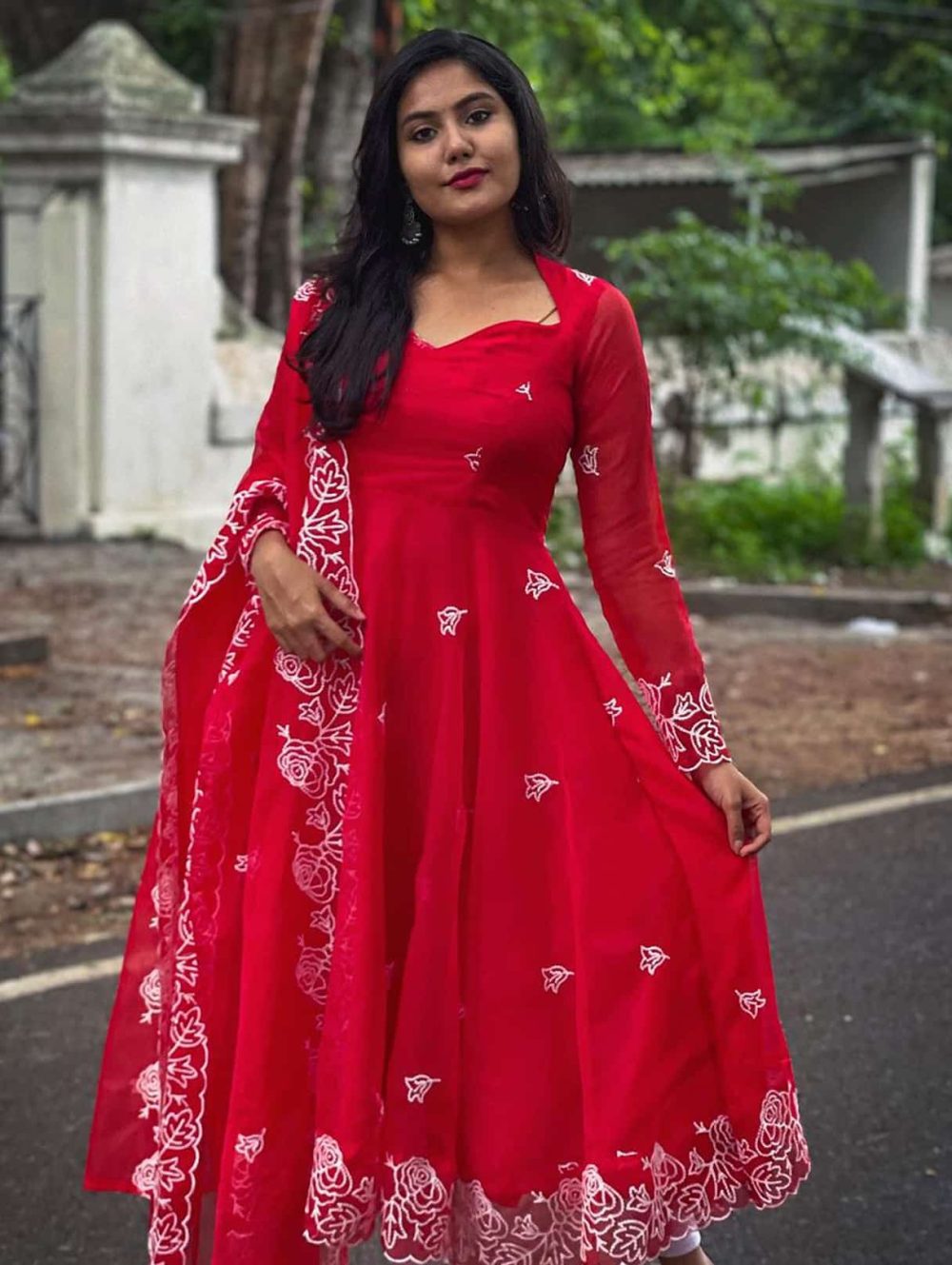 Crafted from high-quality organza, this red Anarkali dress is more than just clothing; it's a statement. It's the embodiment of confidence, elegance, and timeless style. Order your custom-made Ruby Anarkali today and experience the magic for yourself. Don't miss out on this opportunity to elevate your wardrobe and embrace your inner queen!"