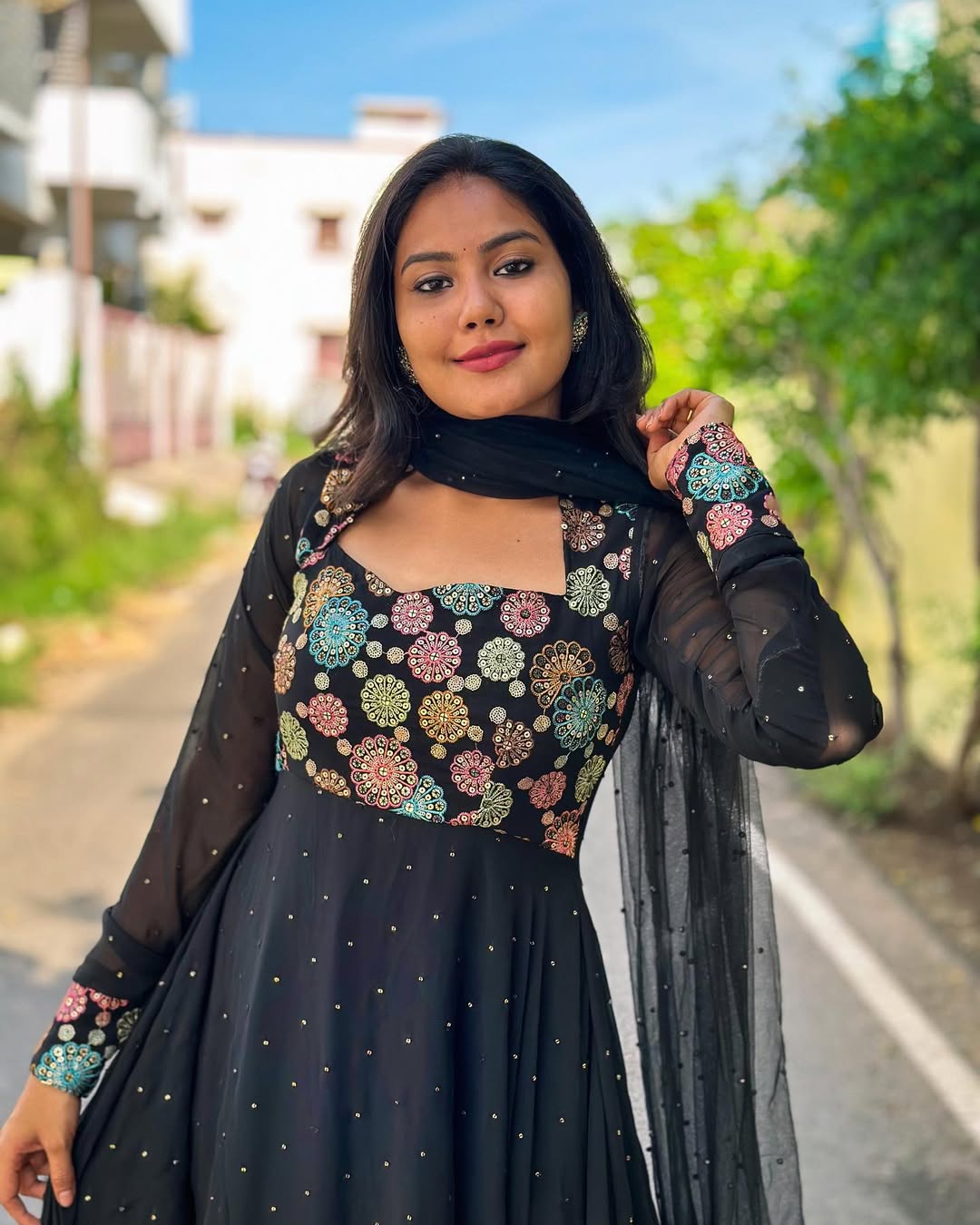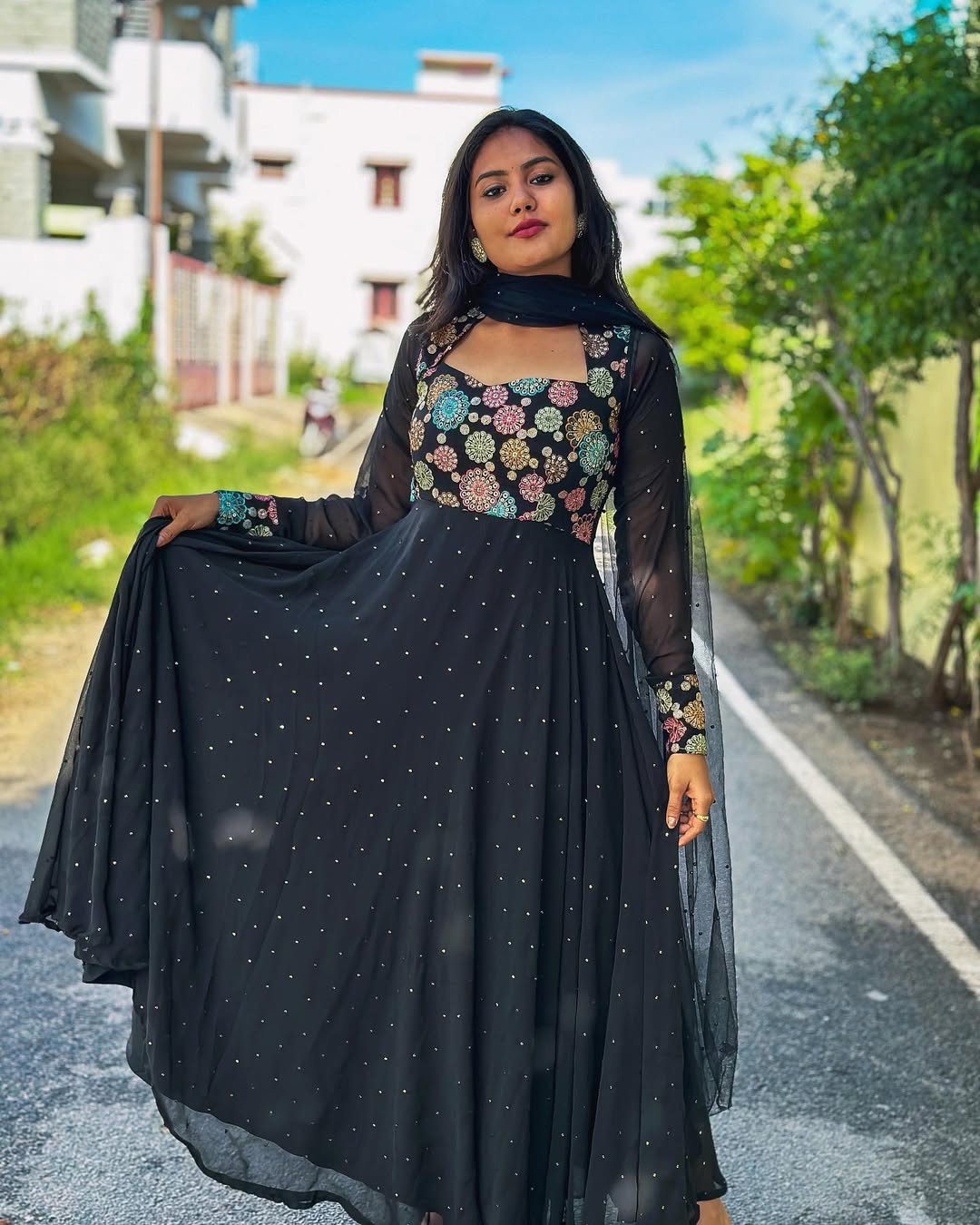 Imagine yourself gliding through the evening, the soft Georgette fabric flowing gracefully around you. This isn't just a dress; it's a celebration of your unique beauty. The intricate mix-match design adds a touch of bohemian charm, while the dazzling mirror sleeve detail adds a touch of modern flair. This dress effortlessly blends traditional craftsmanship with contemporary style.