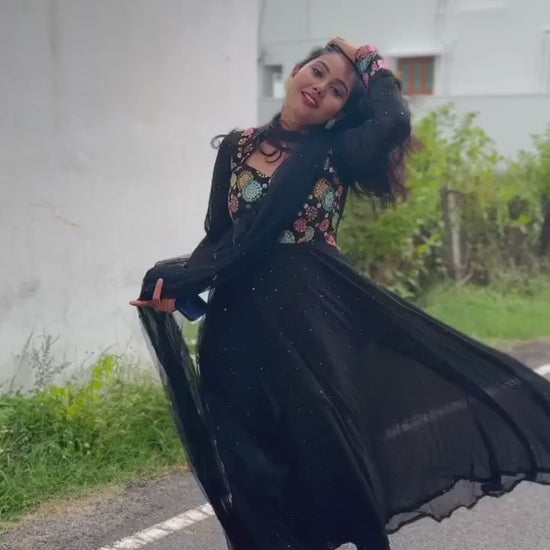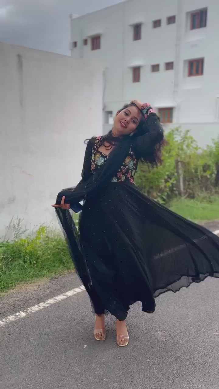 "Elevate your wardrobe with our custom-made women's long dress, designed to fit your measurements with precision. Introducing the Label Kamra long dress, a show-stopping piece that is sure to turn heads at any event. The mesmerizing multicolored sequined Georgette yoke adds a touch of glamour to this breathtaking black dress, making it a must-have for your next special occasion.