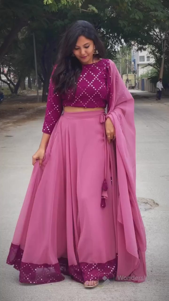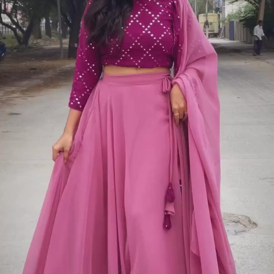 This breathtaking ensemble perfectly blends traditional craftsmanship with modern elegance. The rich mirror-work blouse, paired with a flowing Georgette skirt and a contrasting mirror border, creates a look that is both timeless and utterly unique. The included matching dupatta completes the ensemble, adding a touch of luxurious sophistication perfect for weddings, parties, or any special occasion.