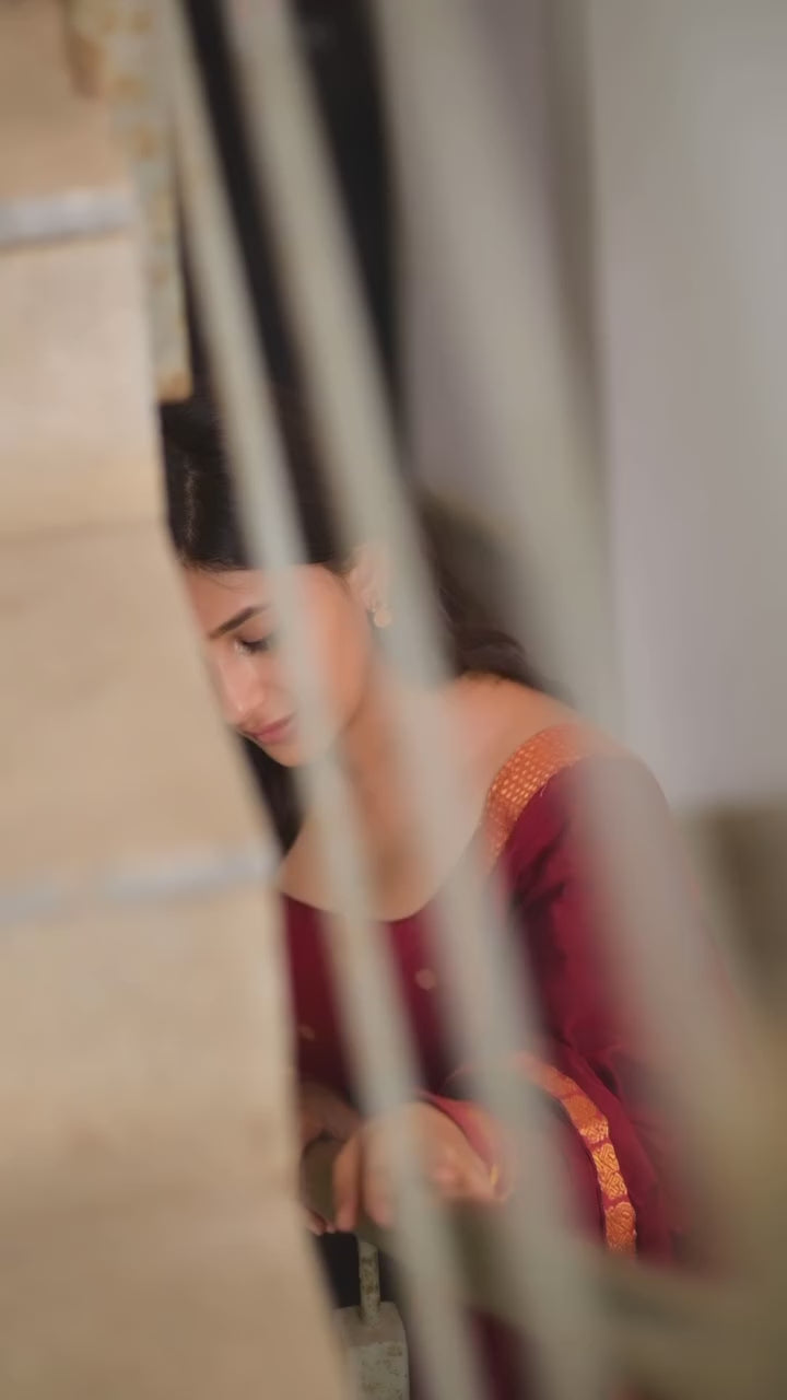 This Kamra creation is more than just a dress; it's an experience. Imagine the luxurious feel of the finest Dupion silk and Narayanpet cotton against your skin, the captivating shimmer of the peacock Zari border detailing, and the graceful drape of the Narayanpet cotton dupatta. This ensemble will elevate any special occasion, ensuring you're the center of attention.