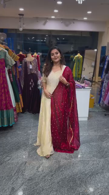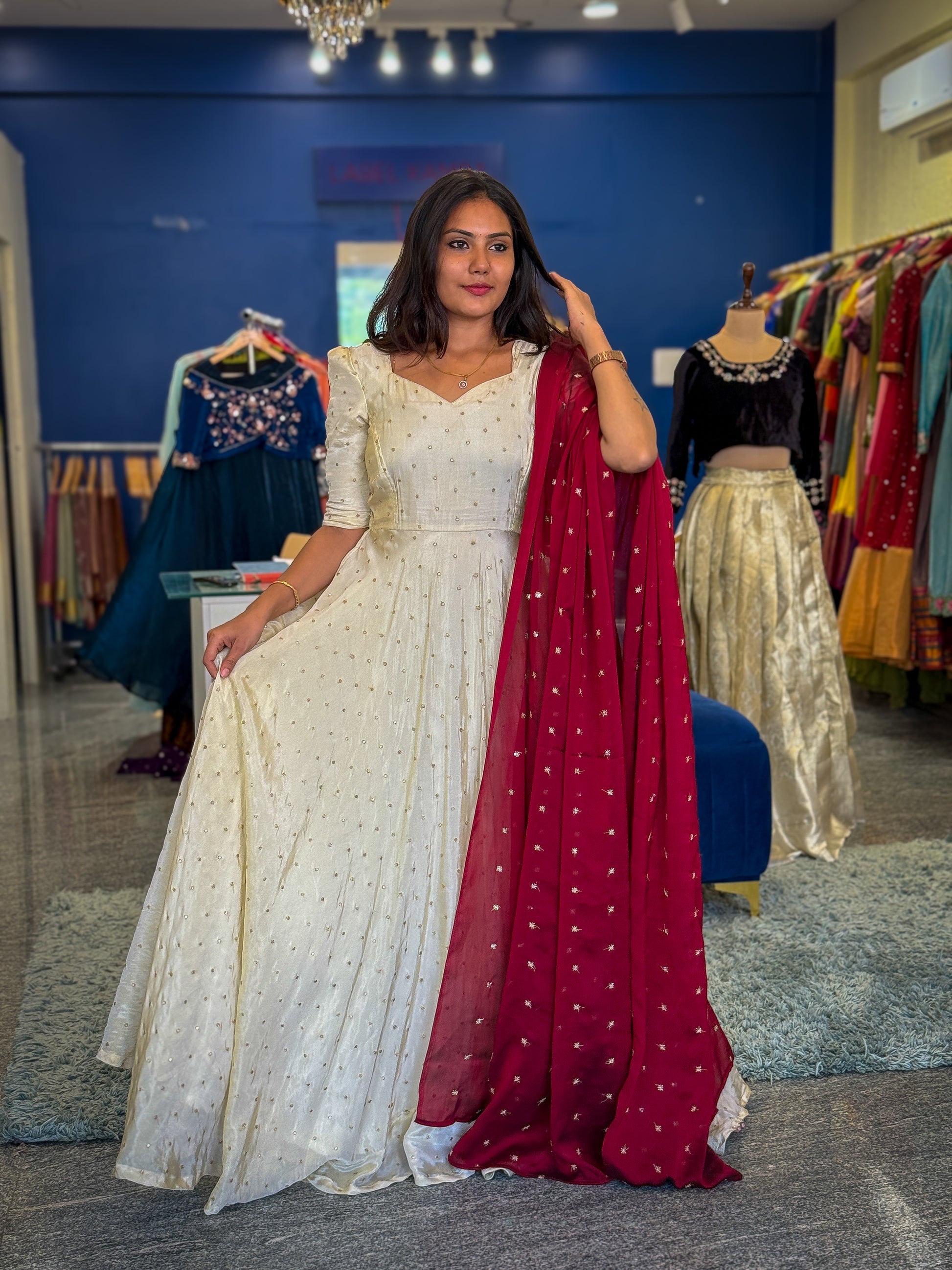 Anarkali: ivory zari tissue Anarkali with sequins embroidery all over.Dupatta: Georgette silk with sequins embroidery all over