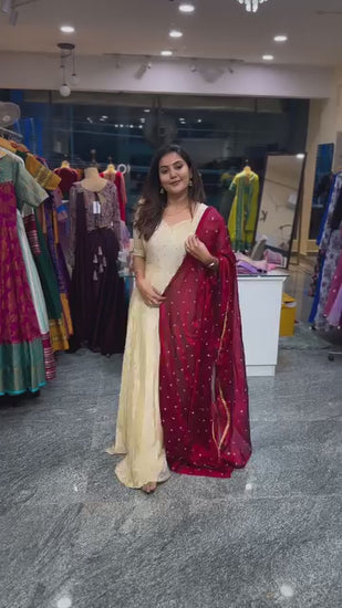"Make a statement at your next special occasion with this breathtaking Anarkali suit. This ivory zari tissue Anarkali, exquisitely adorned with sequins embroidery, is a masterpiece of elegance and sophistication. Prepare to be captivated by its luxurious drape and intricate detailing.