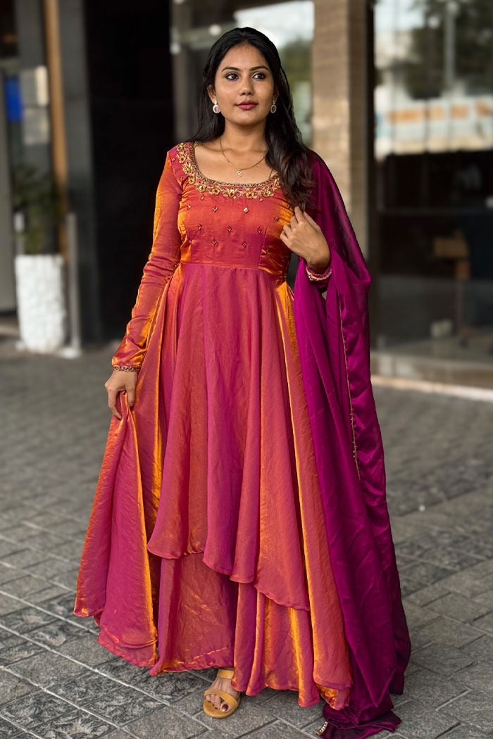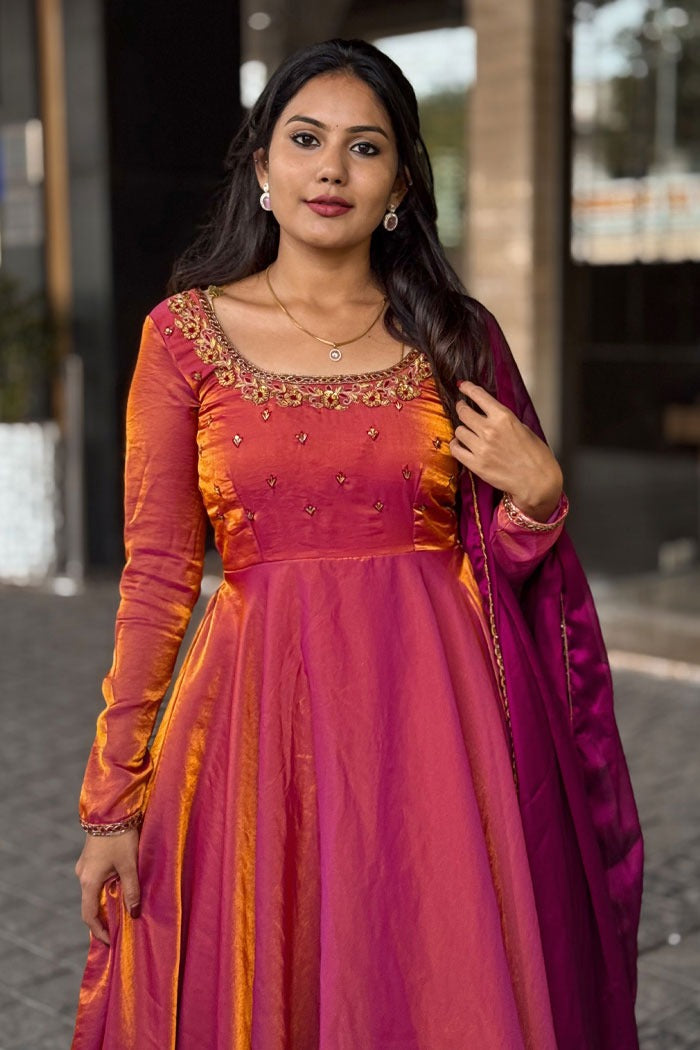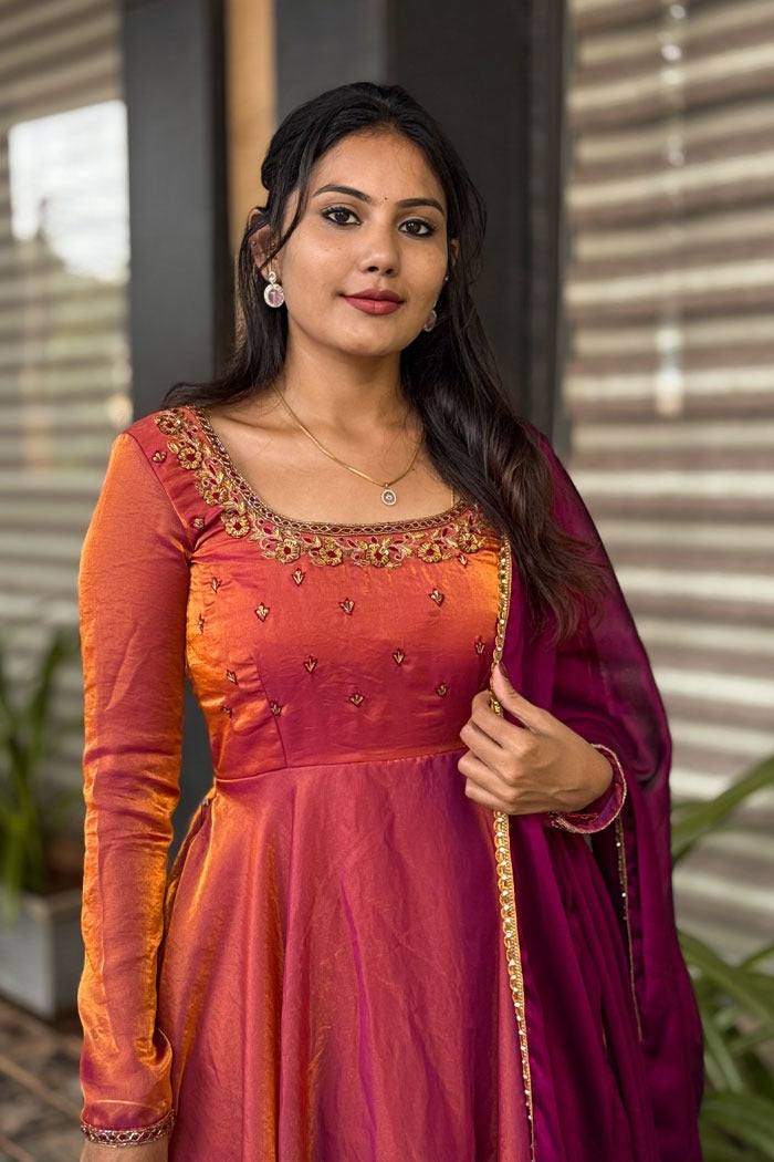 Step into timeless elegance with this double-layer luscious orange space silk gown. Crafted from premium space silk, this gown features exquisite handwork detailing on the yoke, adding a touch of luxury and sophistication. The flowy silhouette and radiant sheen make it a perfect choice for festive occasions, weddings, and celebrations. Experience comfort, charm, and craftsmanship in one stunning outfit.