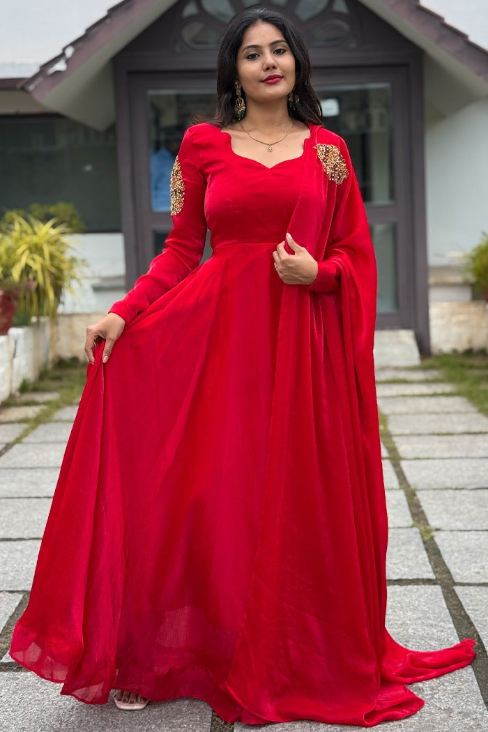 Step into the spotlight with this bright red shiny space-silk long dress, crafted to make every moment unforgettable. The dress features exquisite hand-embellished bead and stone motifs that add a rich sparkle to the ensemble. The sleeves and dupatta are adorned with rich handwork detailing, bringing a luxurious, festive charm.